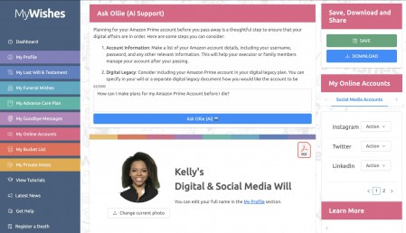 MyWishes advocates for and helps people make plans for their digital legacy and wider wishes. By doing so, each person is able to make plans and safeguard their digital legacy. MyWishes empowers society to document and share ‘what matter most’ to them in both the digital and physical world.